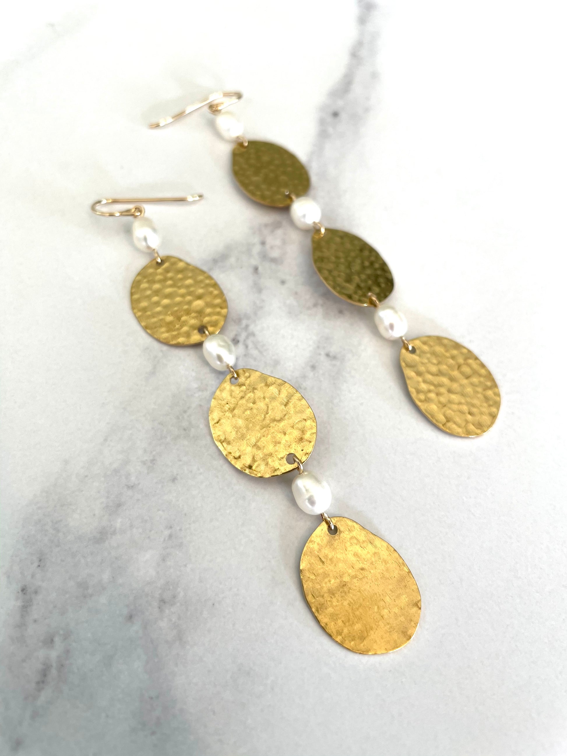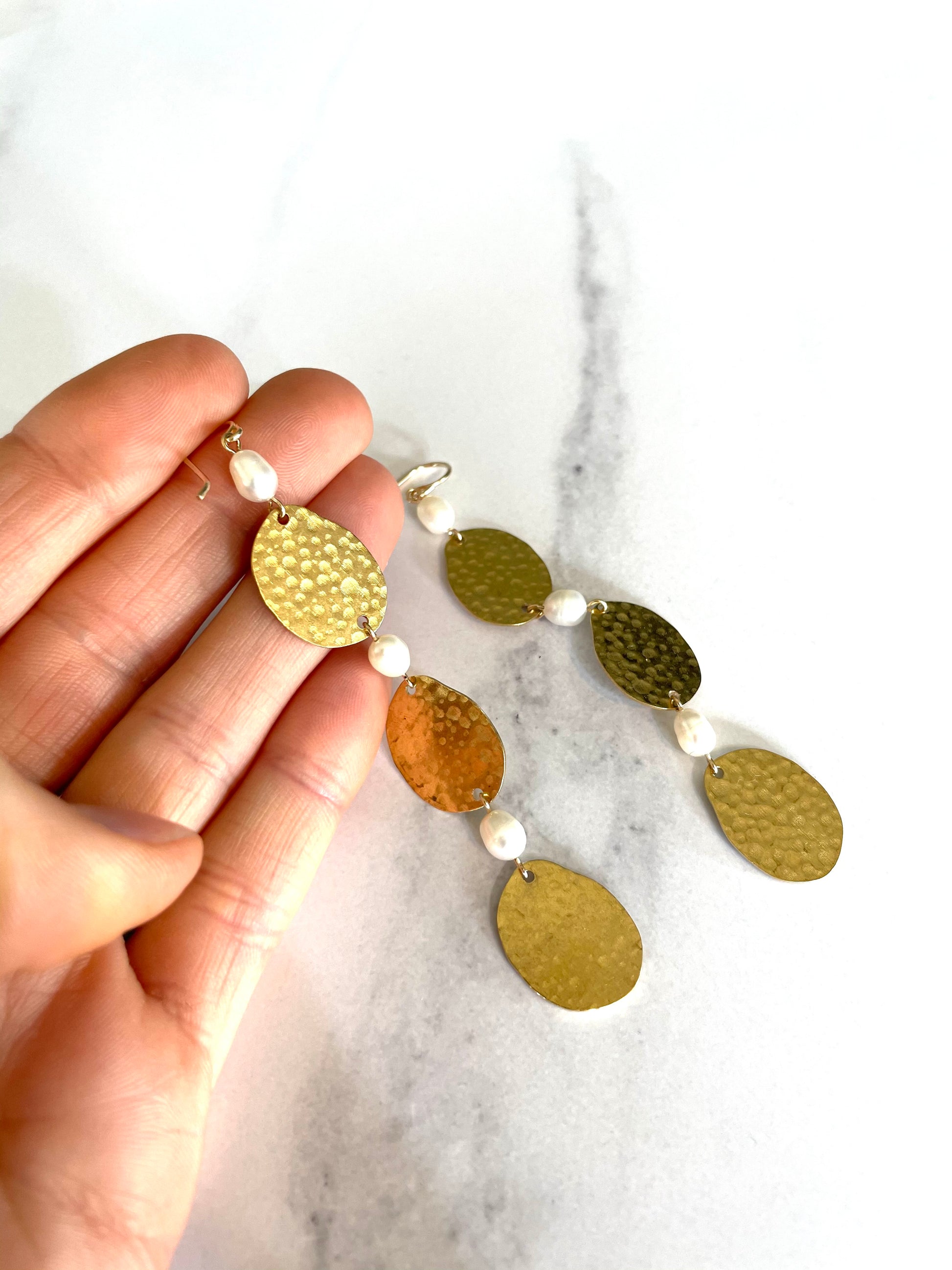 Statement Pearl earrings made with Fresh Water Pearls and textured brass