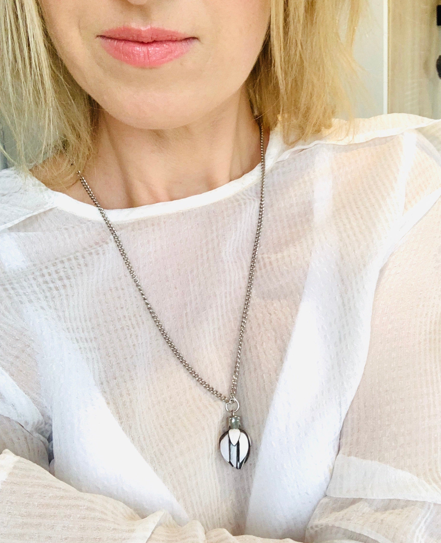 suspended on a 3mm curb link chain 75cm stainless steel silver chain this sits just below lower bra line